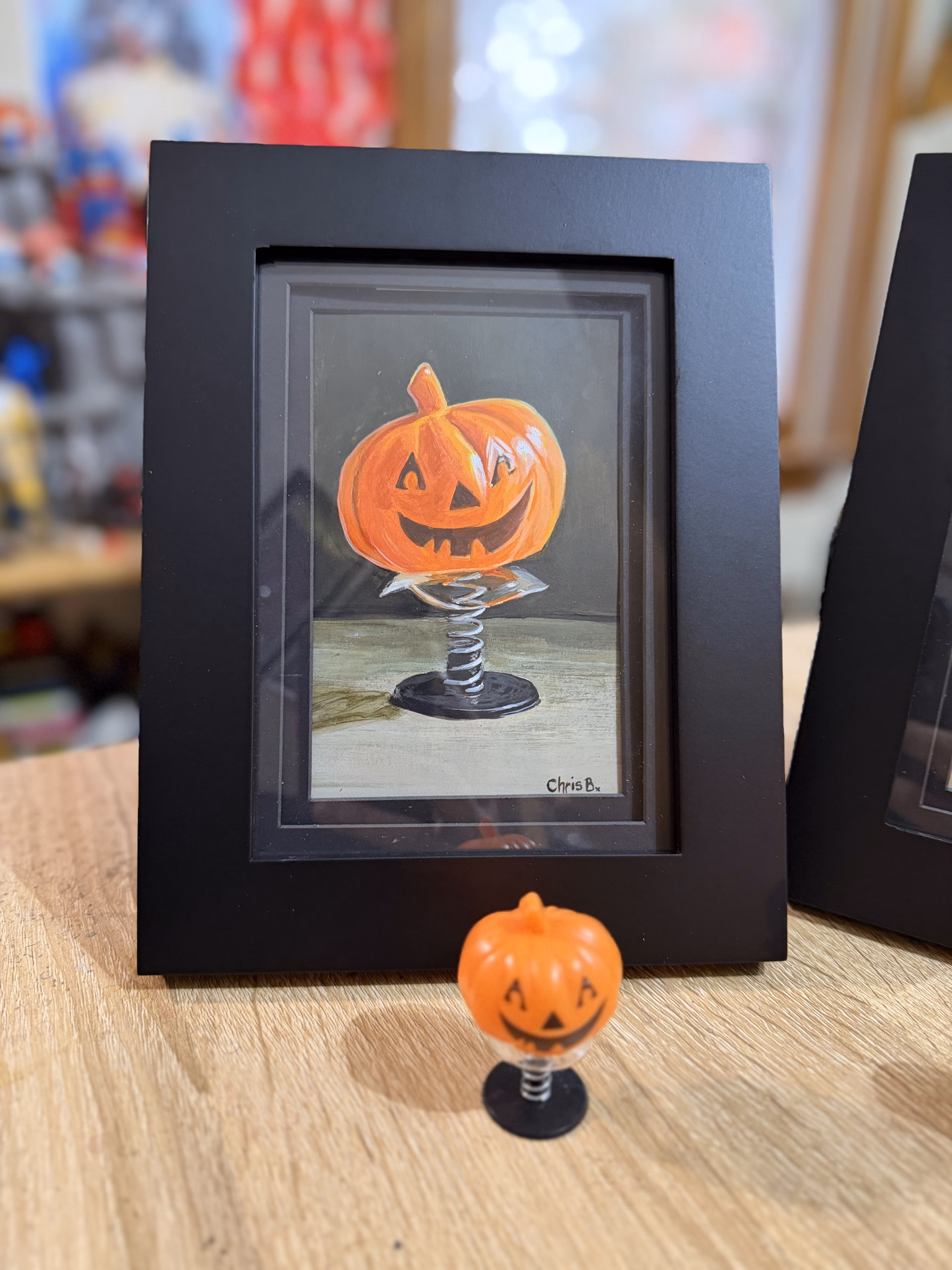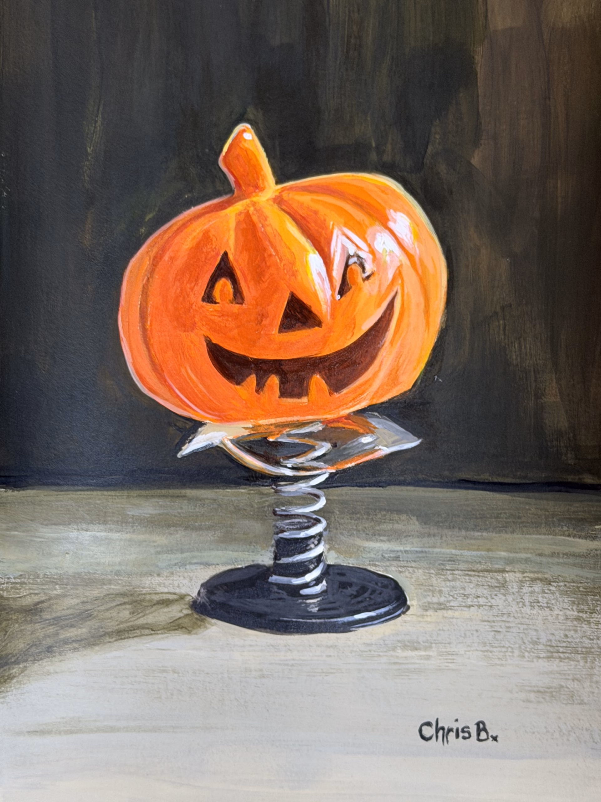 Pumpkin Pop-Up, 5″x7″ original acrylic painting on paper, framed. I’ve always loved little suction cup spring toys.  Pressing them down and waiting for them to pop up into the air was fun for a while, and eventually led to placing it in the palm of my hand and aiming it at my brother.